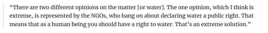 즉, "기업이 너네 땅 사고 거기서 나오는 물을 너네한테 팔고 이게 자본주의니까 우리가 파는 깨끗한 물을 마시기 위해선 그 값을 지불해라. 그러나, 더러운 물을 마시는 것은 내 알바 아니고 이것을 인권하고 연결 짓지 말아라"가 된다. 하.............